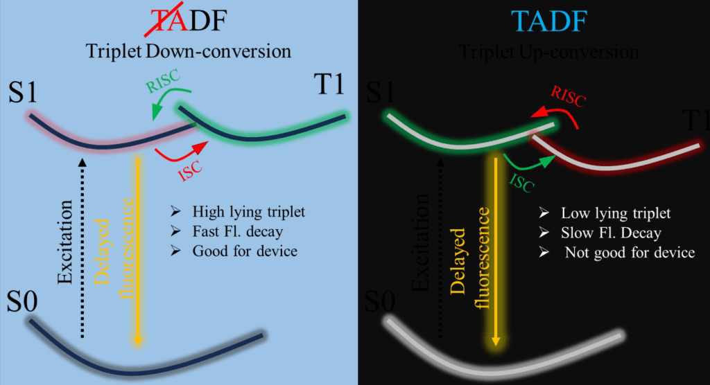 Our group also focuses on achieving energy inversion of the lowest singlet and triplet states to develop Exothermic Delayed Fluorescence (EXDF) emitters with exothermic reverse intersystem crossing (EXRISC). While TADF eliminates metal dependence in OLEDs, TADF emitters face efficiency challenges due to competing processes such as bimolecular annihilations. By inverting the singlet-triplet energy gap, we aim to enhance the thermodynamically allowed down-conversion from T1 to S1. We are currently designing emitters to explore the future potential of these molecules.